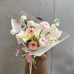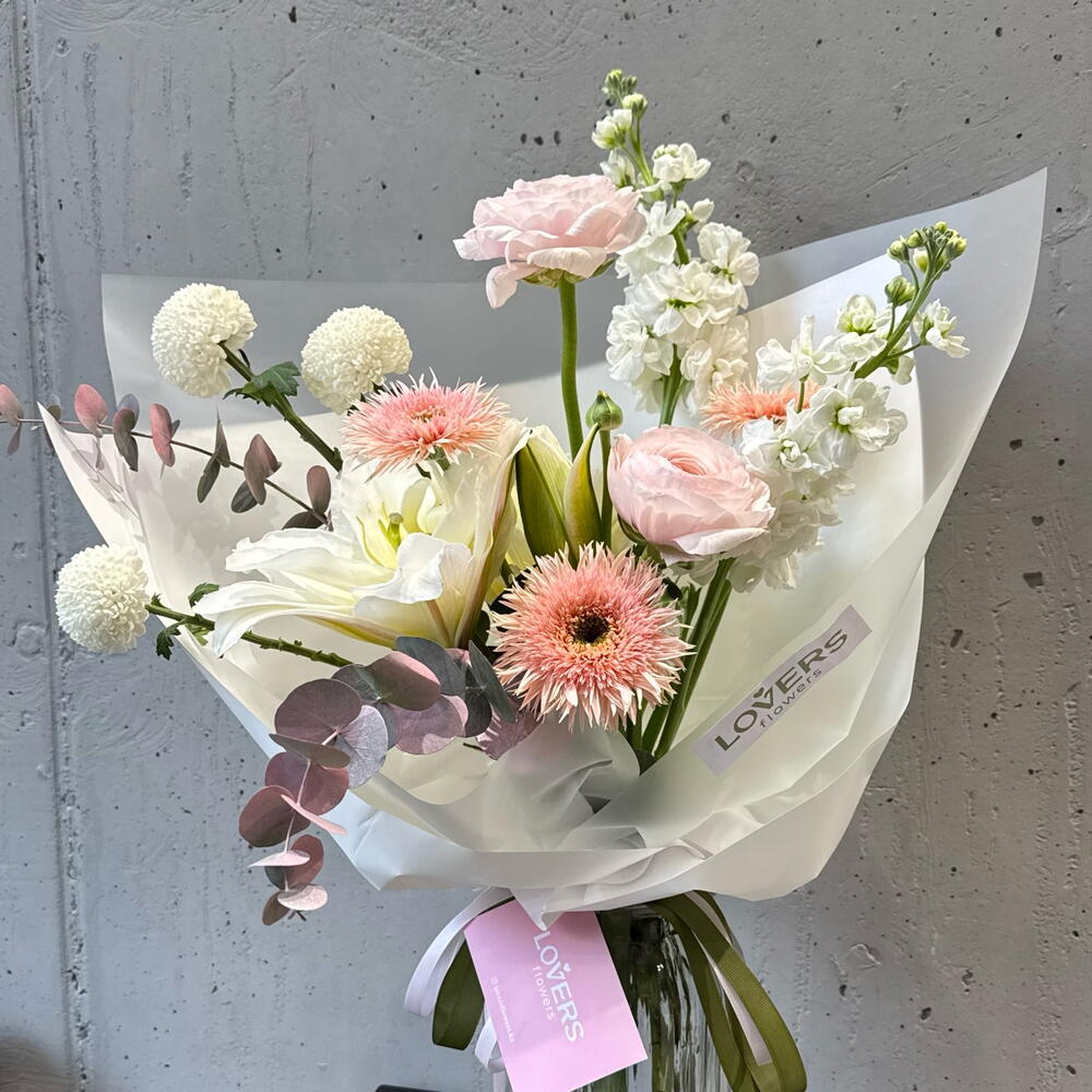Лилия - 1 шт. Маттиола - 2 шт. Гербера - 3 шт. Эвкалипт Цинерея - 2 шт. момоко - 3 шт. Ранункулус - 2 шт.