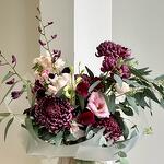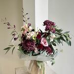 Калла - 2 шт. Лизиантус - 2 шт. Эвкалипт - 4 шт. Роза - 3 шт. орхидея - 4 шт. хризантемы одноголовые - 5 шт.