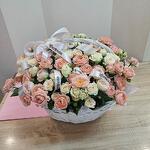 Корзина - 1 шт. Эвкалипт - 5 шт. пионовидные розы - 13 шт. кустовые розы - 15 шт.