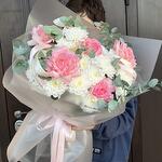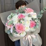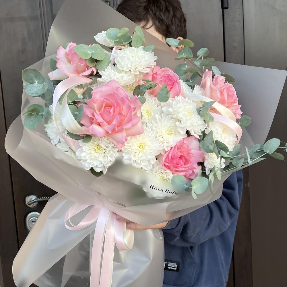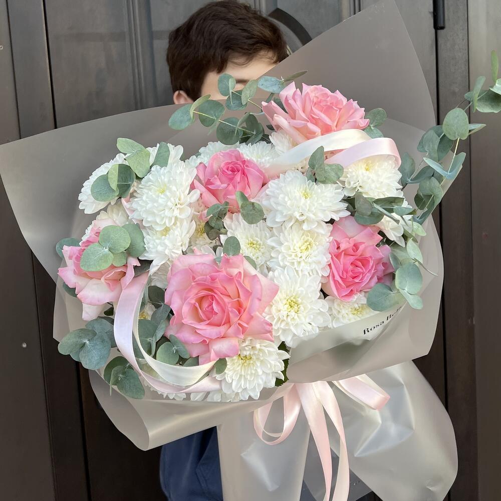 Стильный букет в сочетании роз и хризантем, стойкость до 2х недель, красиво и удобно, оформление матовое трендовое