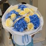 Пышные синие гортензии создают воздушное облако, а пионовидные розы сорта Канделайт добавляют мягкое сияние кремово-персиковых оттенков. Этот букет словно дыхание летнего утра — легкий, романтичный и искренний. Подойдет для признаний, благодарности, любви или просто чтобы подарить ощущения красоты и покоя. 🌸💙