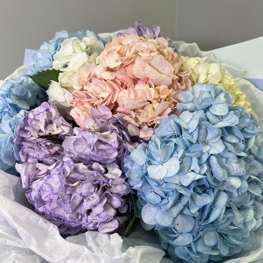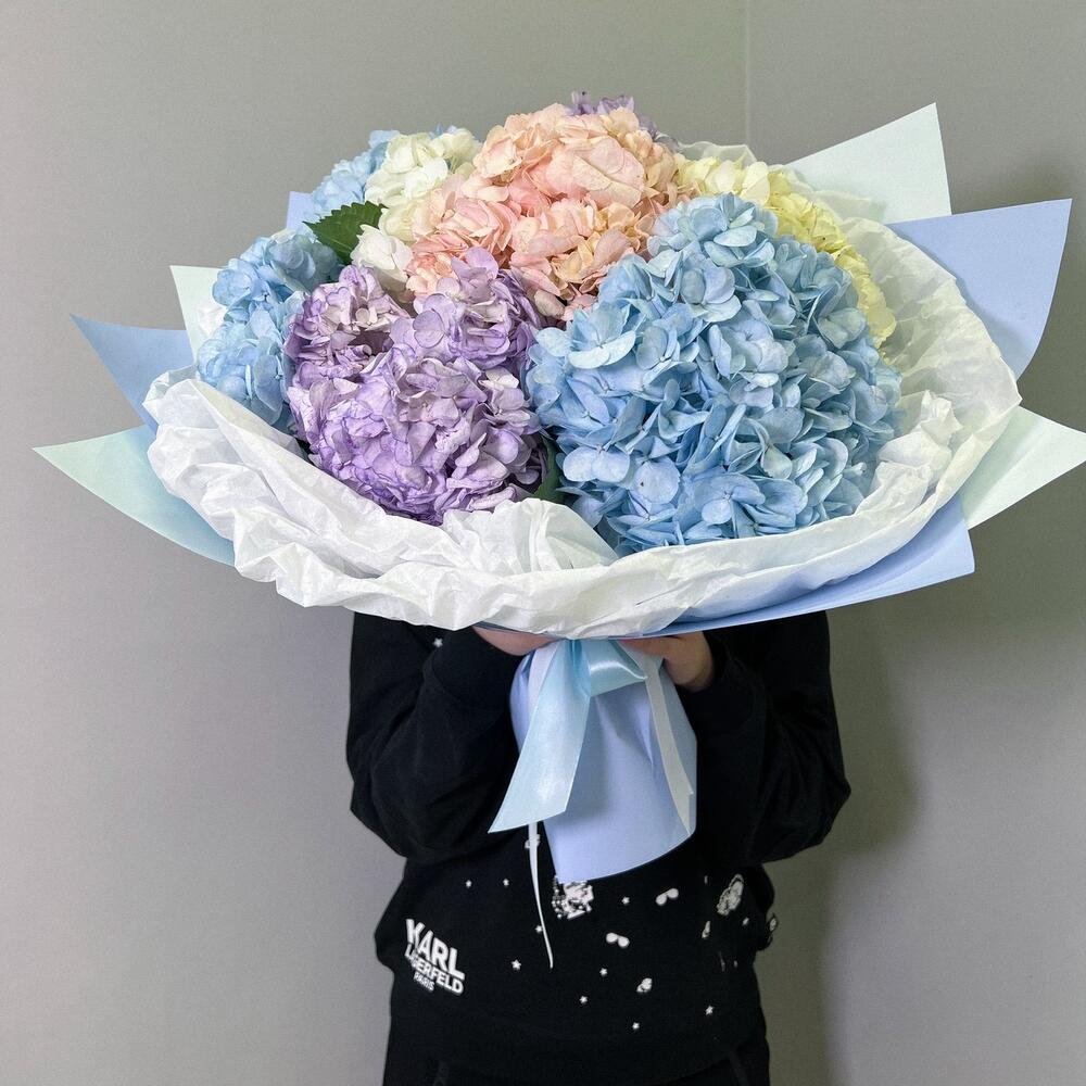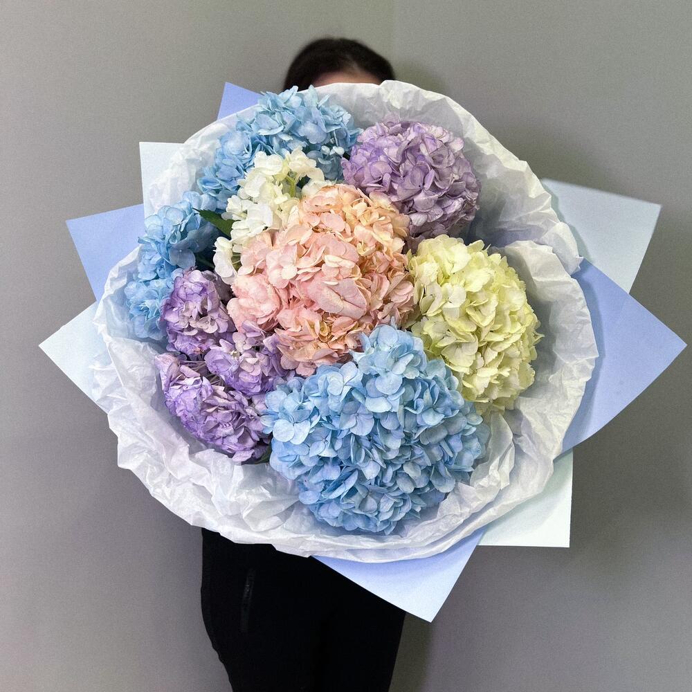Необыкновенно крупные и пышные гортензии от pink rose , как будто созданные для любви и эстетического наслаждения, излучают нежность и романтику. Благодаря своим разнообразным цветам - от нежного розового до глубокого синего и яркого фиолетового - букет гортензий создает удивительное зрелище, наполняющее пространство нежностью и элегантностью.