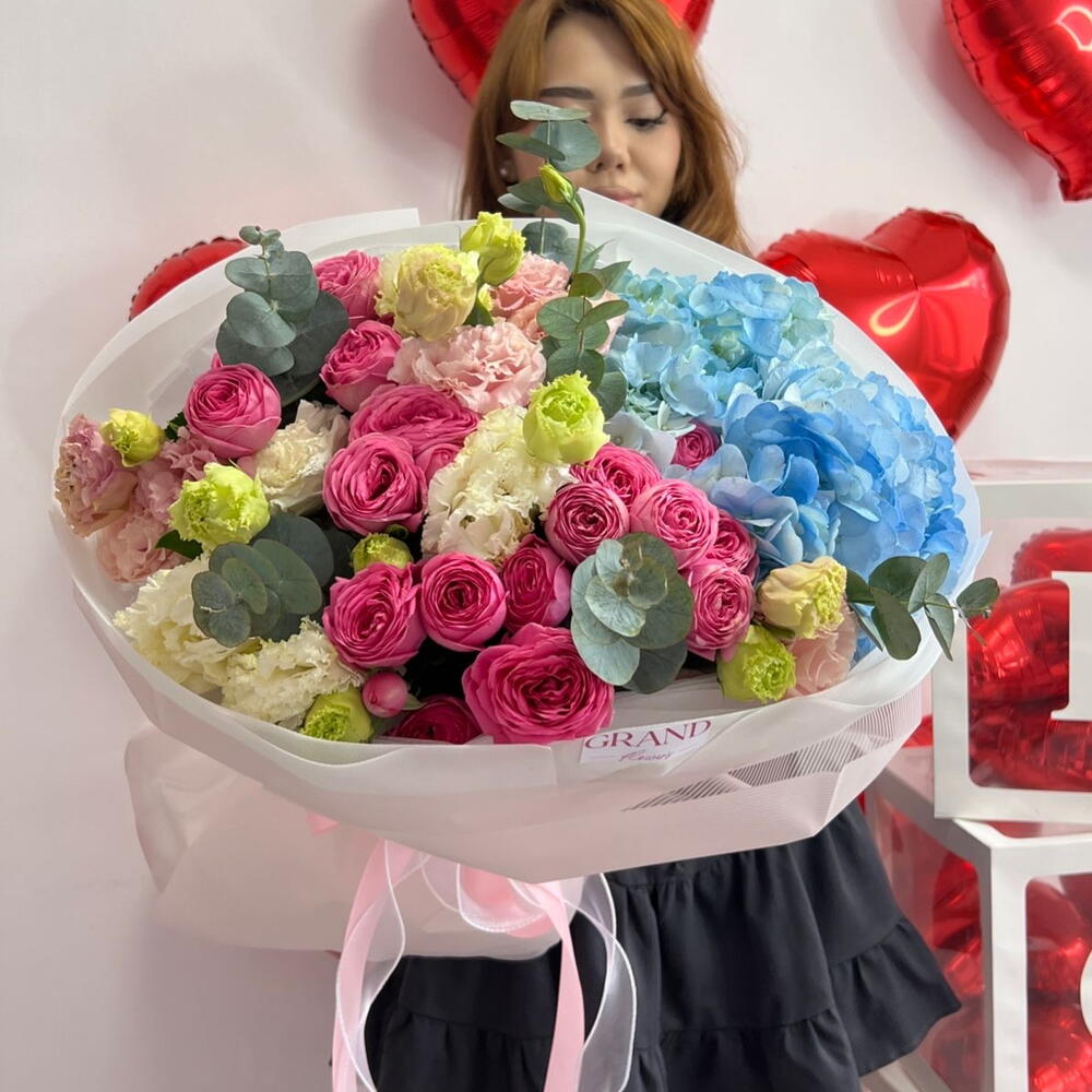Эвкалипт - 3 шт. Эустома - 6 шт. Гортензия Премиум Микс - 2 шт. жизель кустовая роза - 4 шт.
