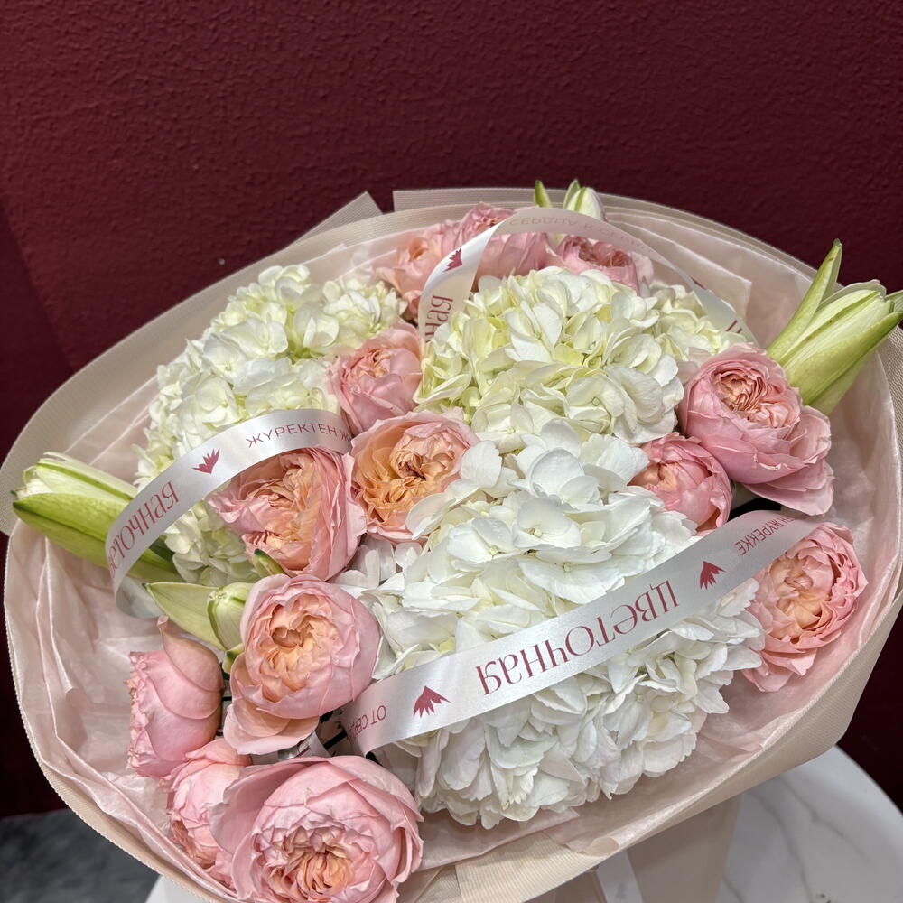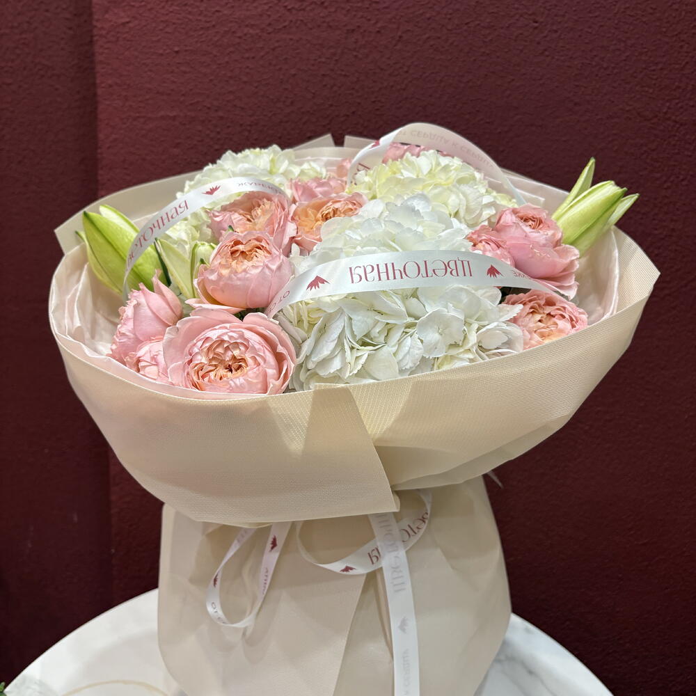 Пышный нежный букет в композиции гортензий,лилии,кустовых роз