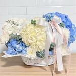 Композиция «Пышные гортензии» в белой корзине – Голубые и белые гортензии с хризантемой