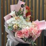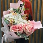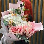Альстромерия - 5 шт. Хризантема кустовая - 5 шт. Эвкалипт - 5 шт. Роза - 5 шт. Лилия Белая - 1 шт.