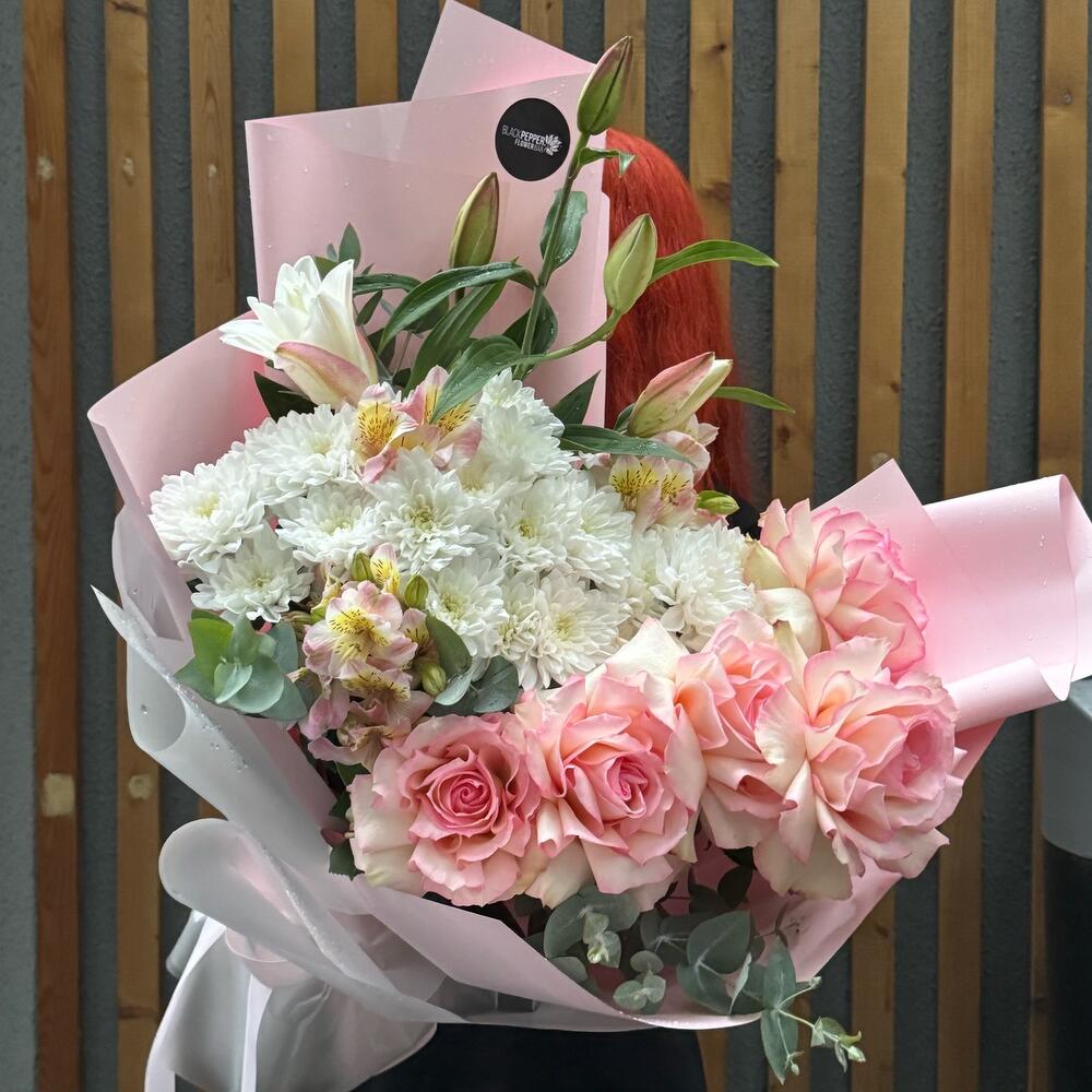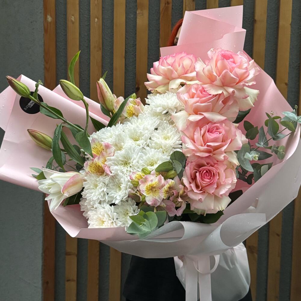 Альстромерия - 5 шт. Хризантема кустовая - 5 шт. Эвкалипт - 5 шт. Роза - 5 шт. Лилия Белая - 1 шт.