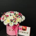 Эвкалипт - 3 шт. мерси конфеты - 1 шт. хризантемы - 5 шт. кустовые розы - 5 шт. розы белые - 7 шт.