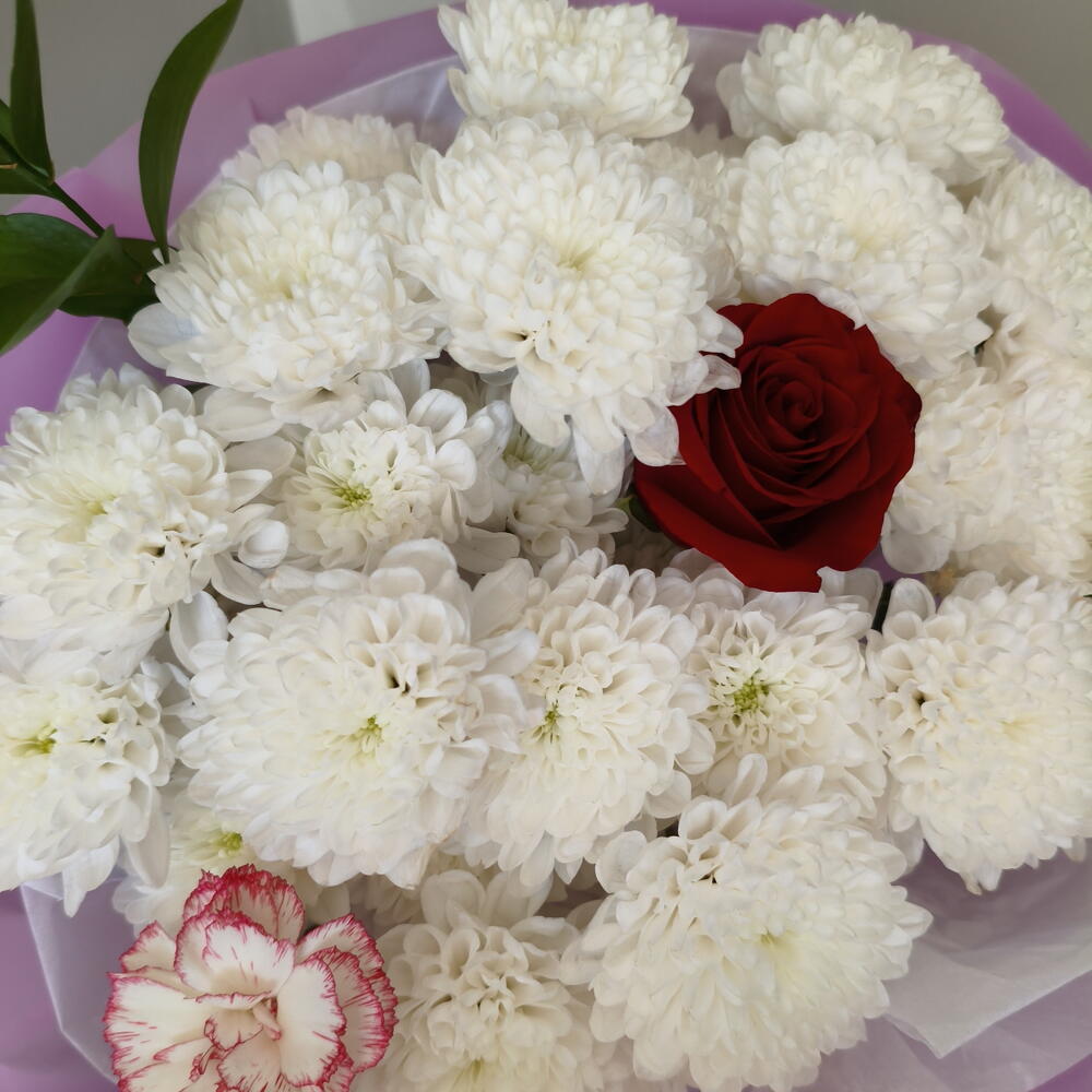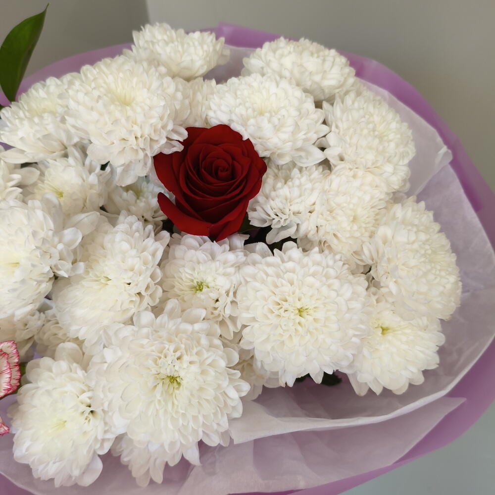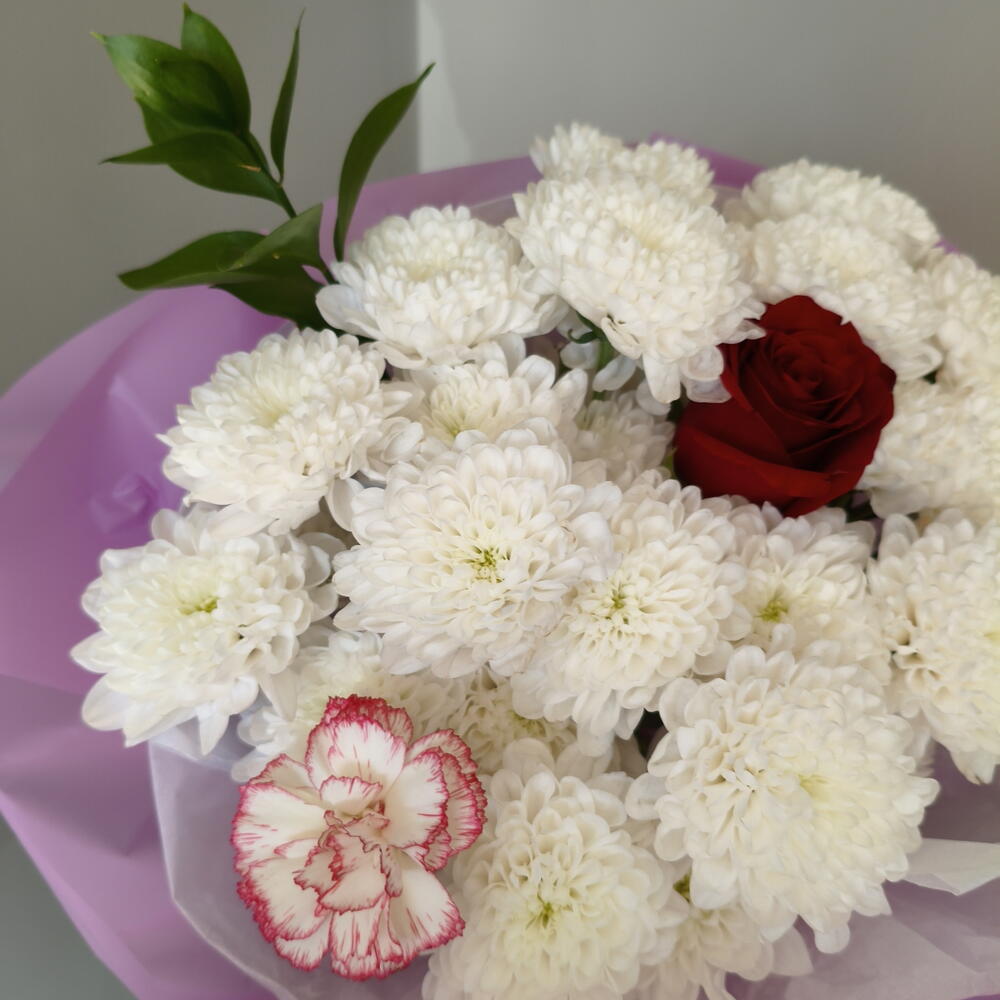 Рускус - 1 шт. Диантус - 1 шт. Роза 60 см - 1 шт. хризантемки - 5 шт.