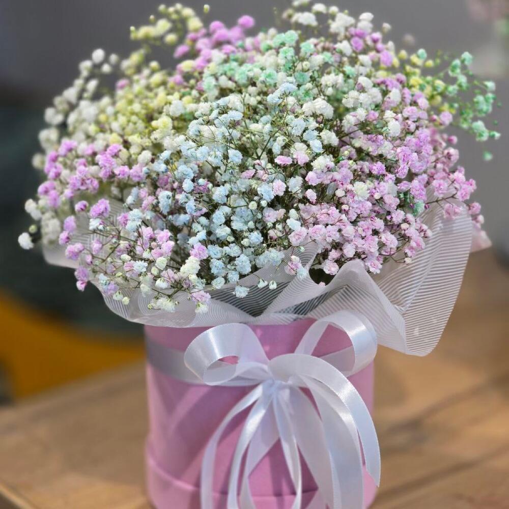 Коробка шляпная - 1 шт. гипсофила радужная - 7 шт.