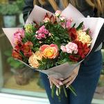 Альстромерия - 5 шт. Писташ - 3 шт. Роза - 3 шт. Упаковка - 1 шт. Диантус - 2 шт.