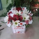 РАФФАЭЛЛО – самые известные и любимые конфеты , уже ставшие неотъемлемой частью жизни потребителей. Такой успех стал возможным благодаря множеству факторов, но прежде всего – благодаря уникальному сочетанию неповторимого вкуса, изысканной белоснежной упаковки и, конечно, романтического имиджа. Мы ее немного обыграли цветами и создали очень оригинальный сюрприз. В композиции используются кустовые хризантемы сорта бакарди, альстромерия красная, кустовые гвоздики и в центре композиции очаровательная красная роза.