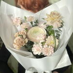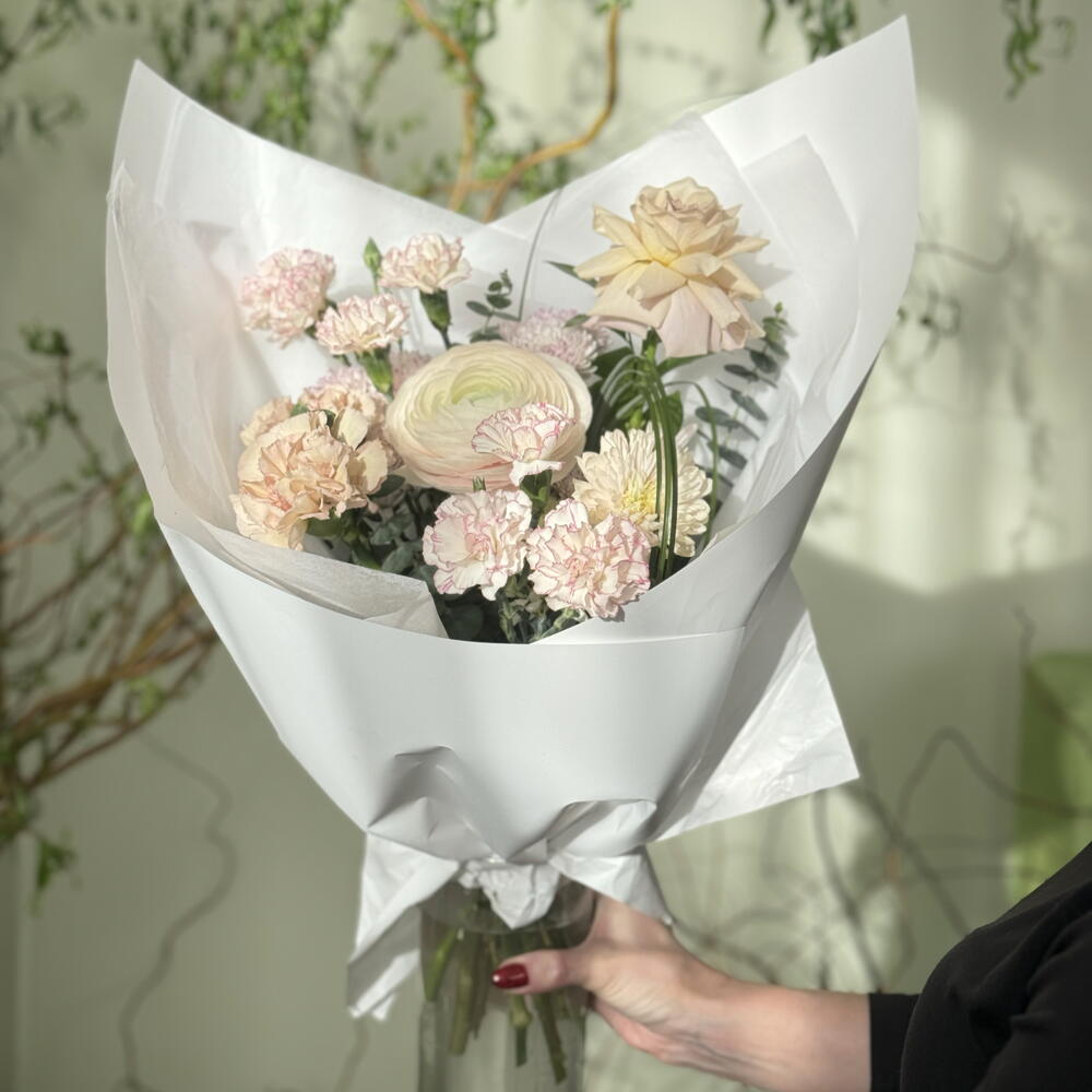 dianthus - 2 шт. ranunculus hanoi - 1 шт. ruscus leaves - 1 шт. eucalyptus leaves - 5 шт. chrysanthemum spray - 4 шт. spray dianthus - 2 шт. rose menta ecuador - 1 шт.