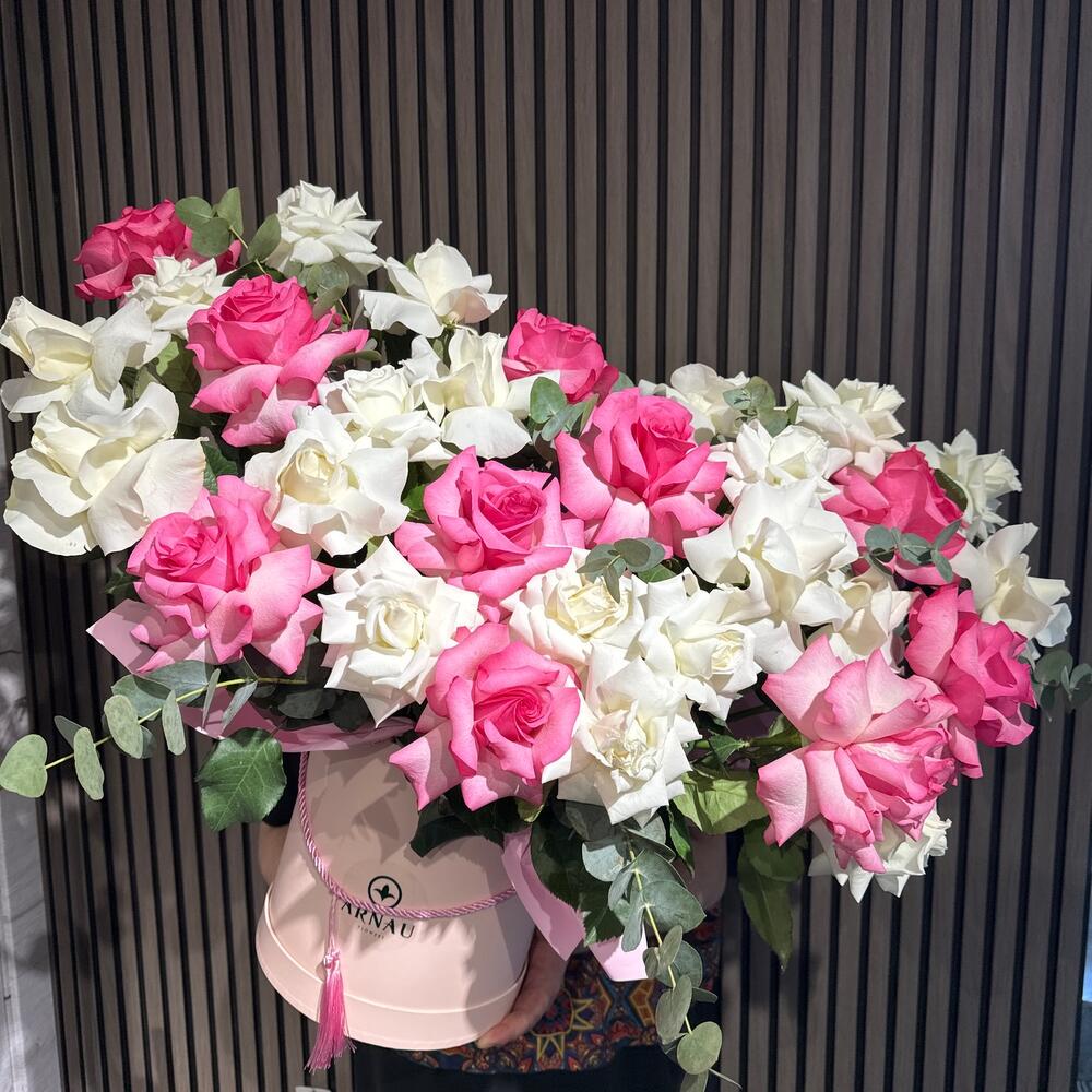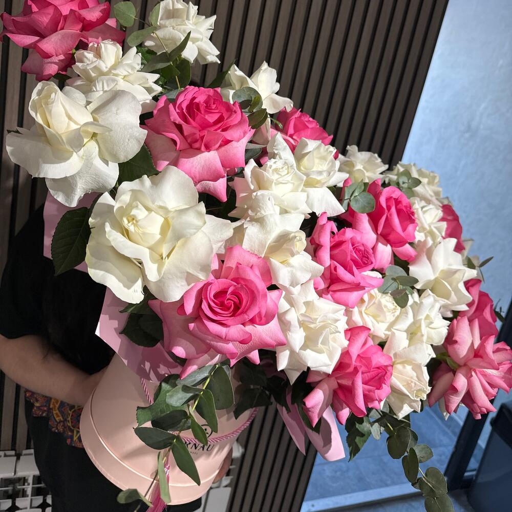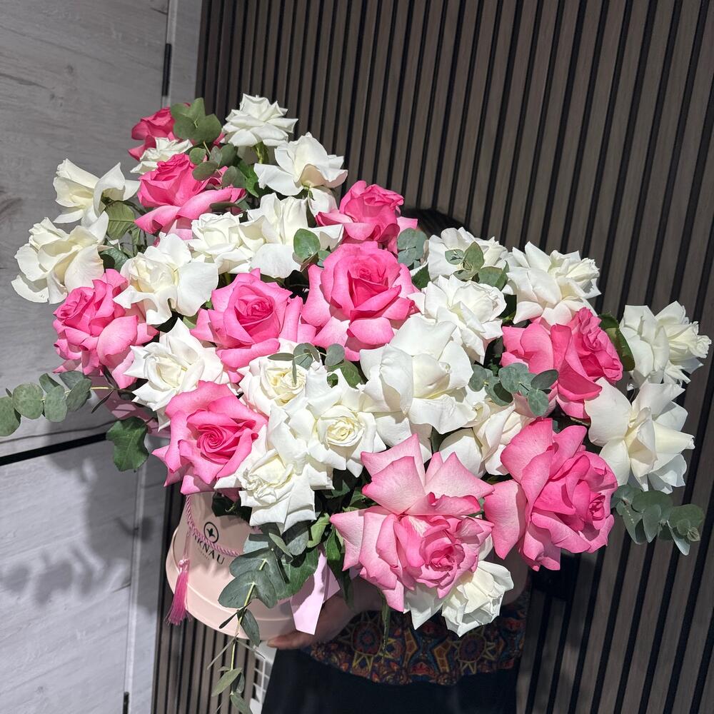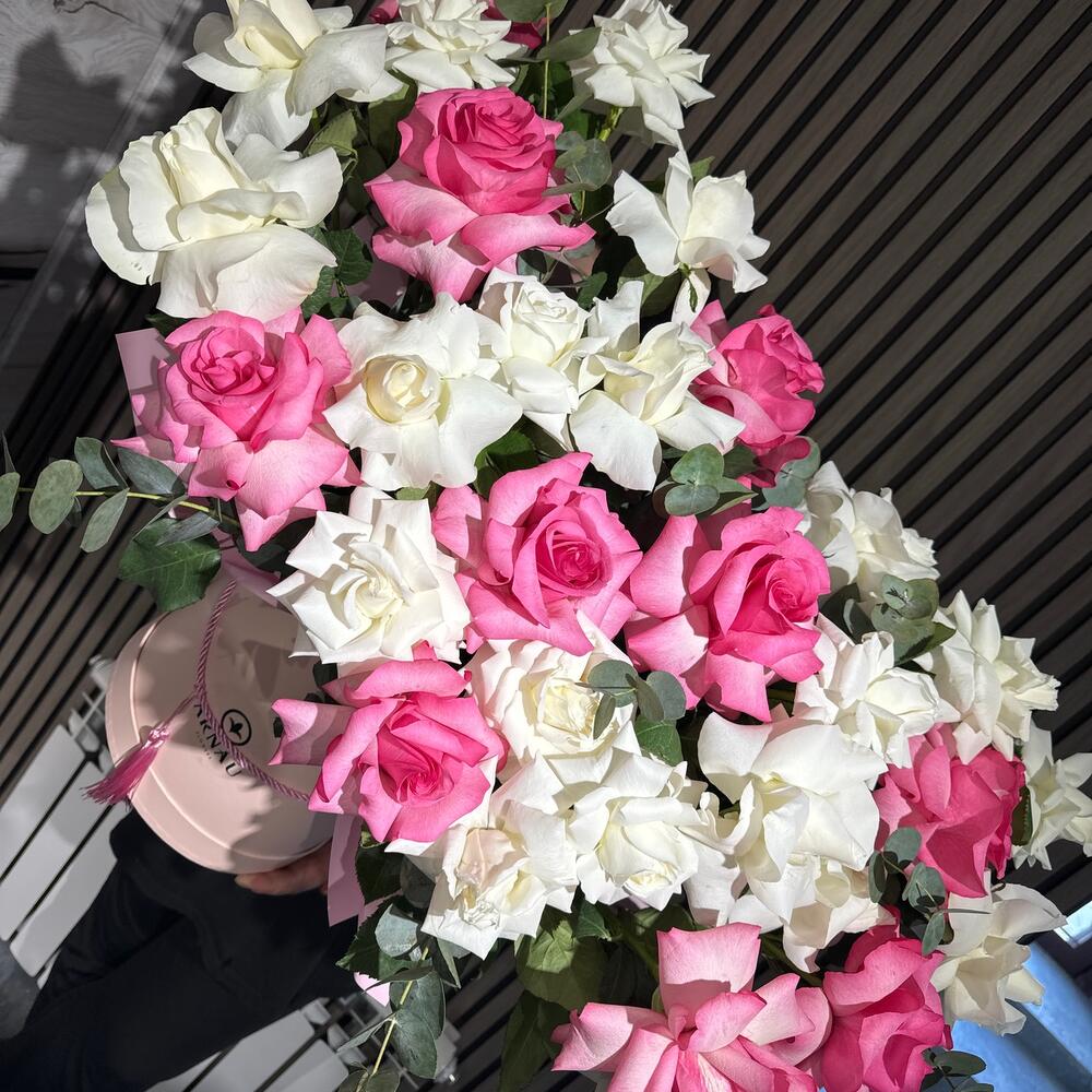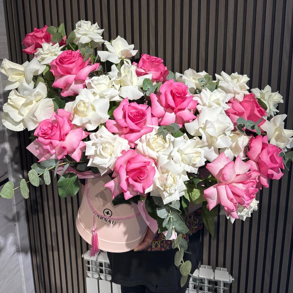 Эвкалипт - 5 шт. розы белые эквадор - 15 шт. коробка большая шляпная - 1 шт. аквабумага - 2 шт. розы фул монти - 10 шт.
