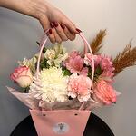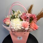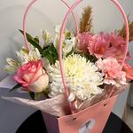 Альстромерия - 2 шт. Роза - 2 шт. Хризантема - 1 шт. Гвоздика - 2 шт. Сумка - 1 шт.