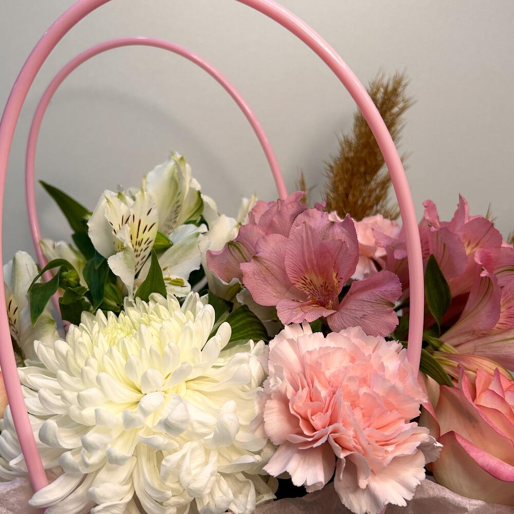 Альстромерия - 2 шт. Роза - 2 шт. Хризантема - 1 шт. Гвоздика - 2 шт. Сумка - 1 шт.