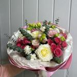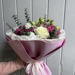 Лизиантус - 3 шт. Кустовая роза - 2 шт. Роза одноголовая - 3 шт. Роза пионовидная - 4 шт. Эвкалипт Микс - 5 шт. Кустовой диантус - 2 шт.