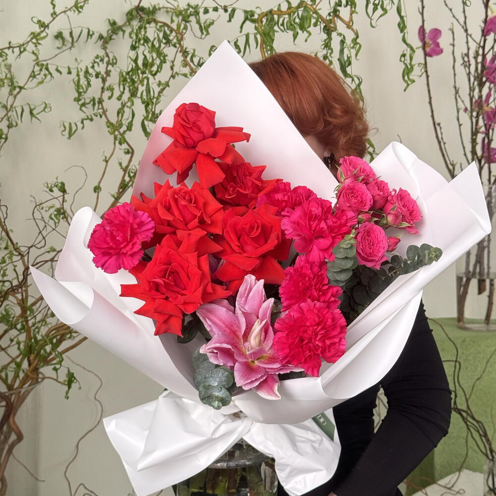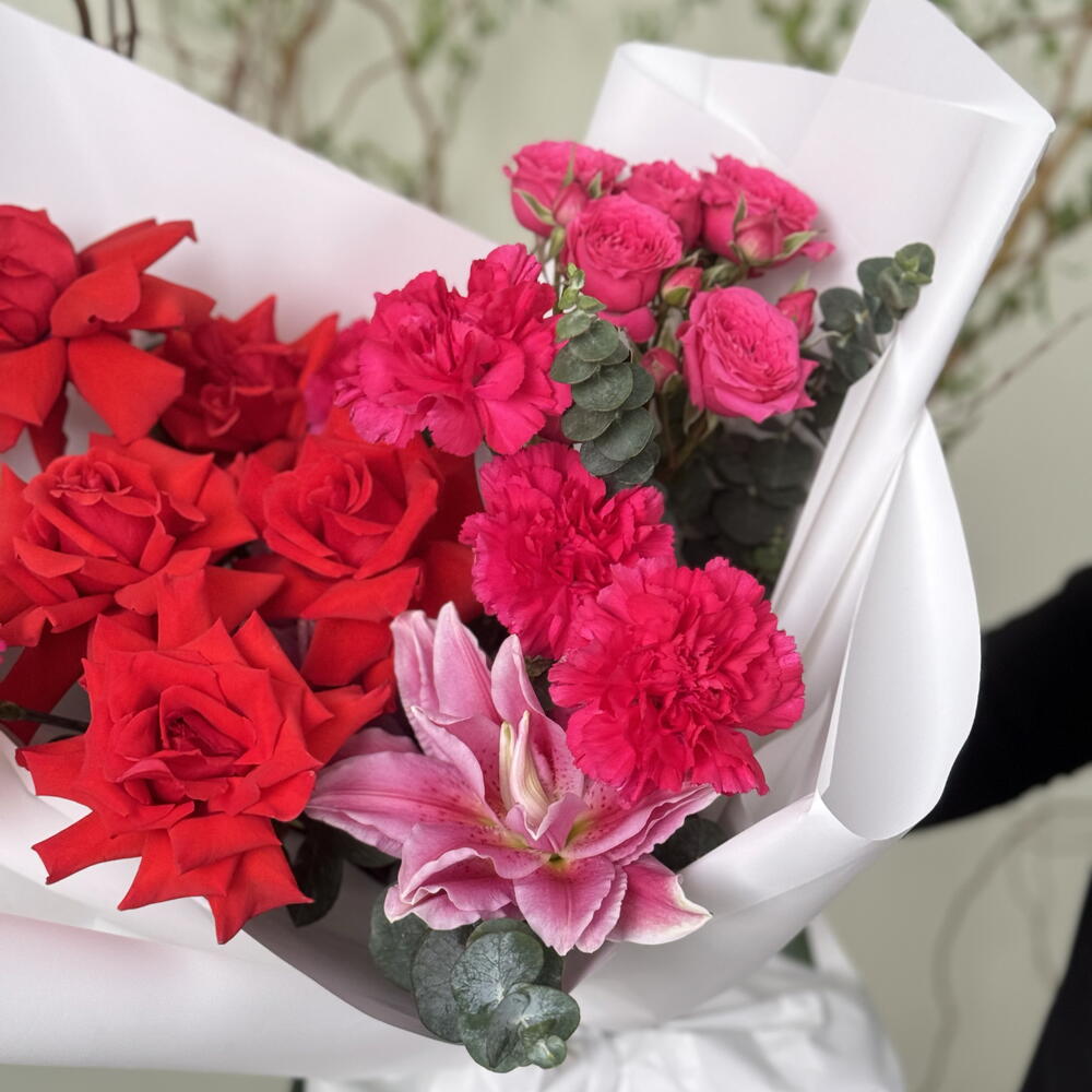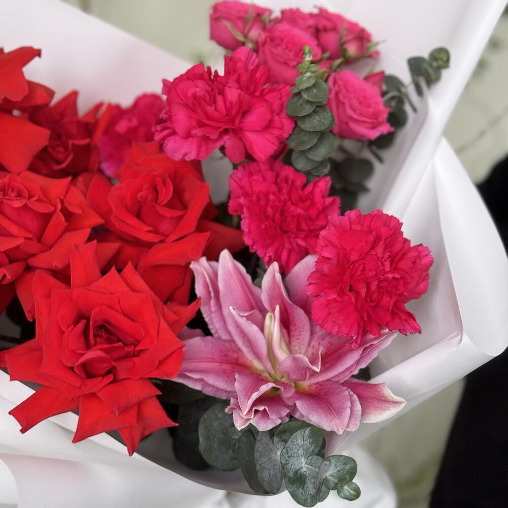 nina роза эквадор - 5 шт. dianthus pink - 5 шт. spray rose pink - 1 шт. eucalyptus leaves - 7 шт. peony lilly - 1 шт.