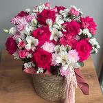 Альстромерия - 3 шт. Статица - 4 шт. Роза - 10 шт. Хризантема - 2 шт. Амарант - 1 шт. Спрей роза - 4 шт.