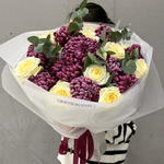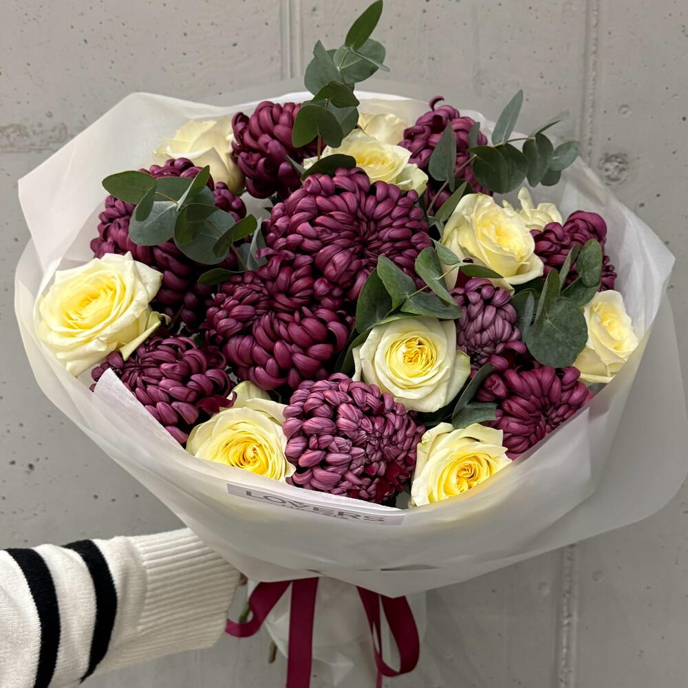 Эвкалипт Цинерея - 2 шт. розы - 9 шт. бигуди хризантема - 9 шт.