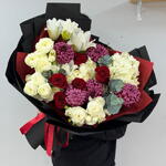 Гортензия - 1 шт. Эвкалипт - 3 шт. Лилия Белая - 1 шт. алые розы - 5 шт. бигуди хризантема - 5 шт. белые спрей розы - 5 шт.
