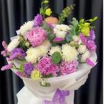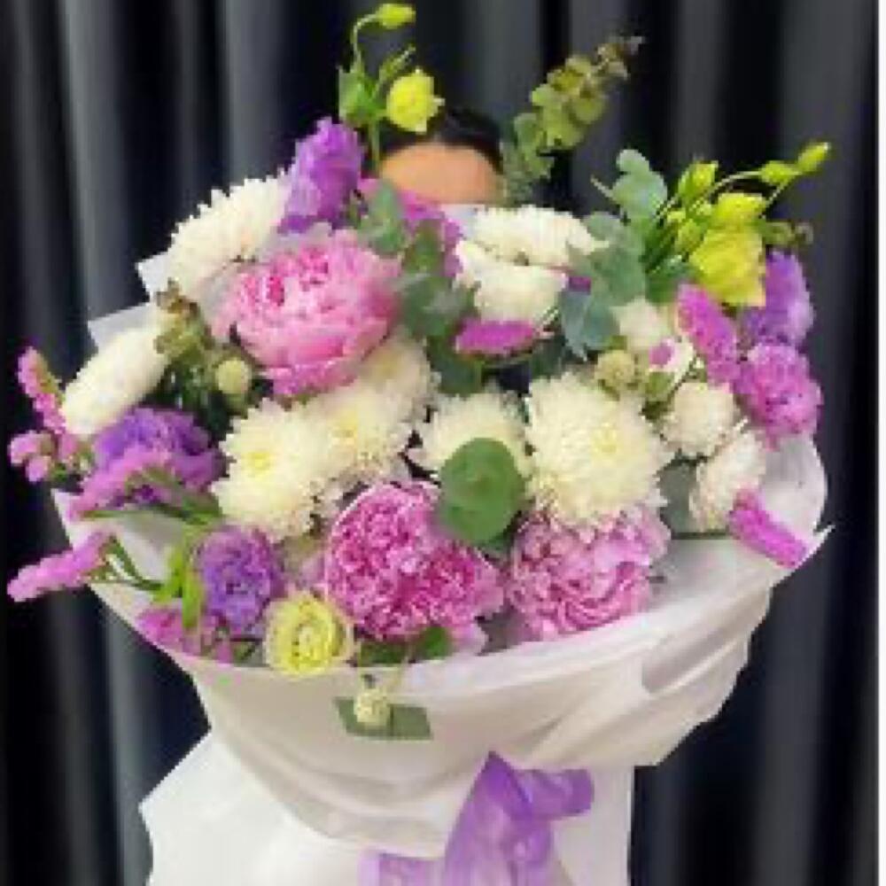 Пион - 3 шт. Статица - 3 шт. Эвкалипт - 2 шт. Эустома - 3 шт. Фоамиран - 5 шт. Калька упаковка - 4 шт. хризантемы - 3 шт. хризантемы кустовые - 3 шт.
