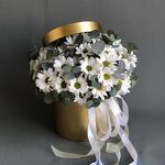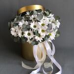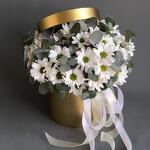 Хризантема кустовая - 3 шт. Эвкалипт - 3 шт. Коробка шляпная - 1 шт. Оазис флористический - 1 шт. бант атласный - 1 шт.