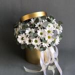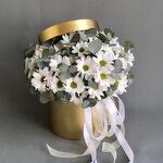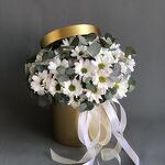 Роскошная композиция из кустовых Ромашковых хризантем в золотой коробке будет подарком на любой праздник будь то день рождения или юбилей женщине, девушке, коллеге по работе, любимой подруге. Композиция из очень стойких хризантем отлично впишется в любой интерьер и будет долго радовать получателя.