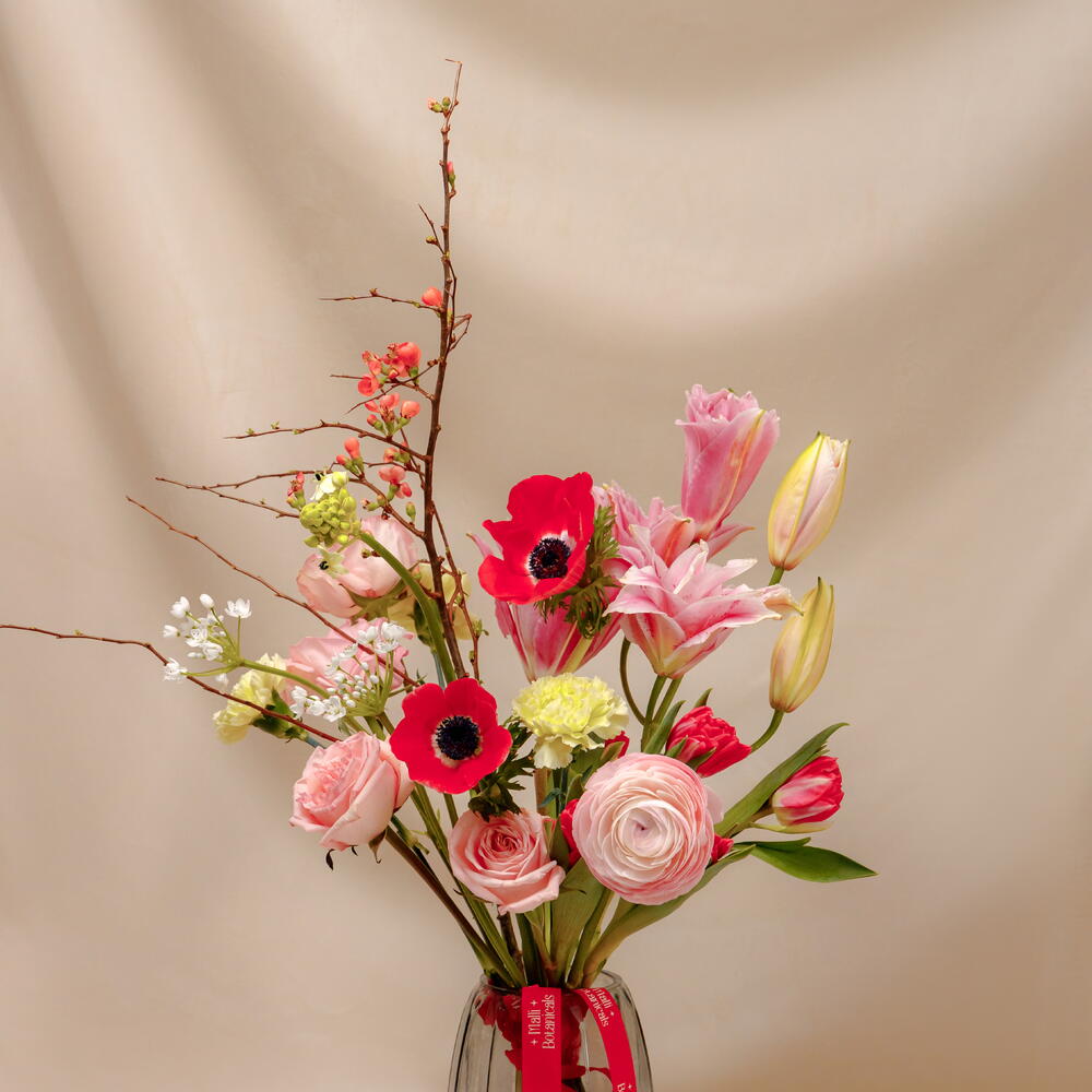 Анемон - 2 шт. Лилия - 1 шт. Тюльпан - 5 шт. Гвоздика - 3 шт. Орнитогалум - 1 шт. Аллиум - 2 шт. Голландская роза - 4 шт. Айва - 1 шт. Ранункулус - 1 шт.
