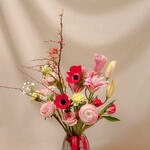 Сборный букет в благородной нежно-розовой гамме из экзотичных цветов. В составе ранунклюсы, анемоны, пионовидные лилии, хеномелис, тюльпаны, гвоздика. Букет упакован в тематическую бумагу и белую коробку с тематической открыткой по запросу. Состав цветов на фото — примерный, но букет будет в изображенной цветовой гамме, настроении и размере. На фото размер М.
