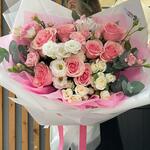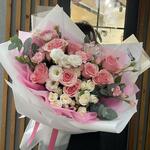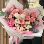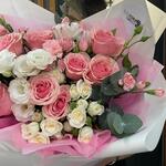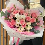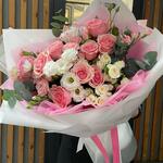 Роза - 9 шт. Кустовая роза - 6 шт. Эустома - 4 шт. Диантус - 6 шт. Эвкалипт Микс - 4 шт.