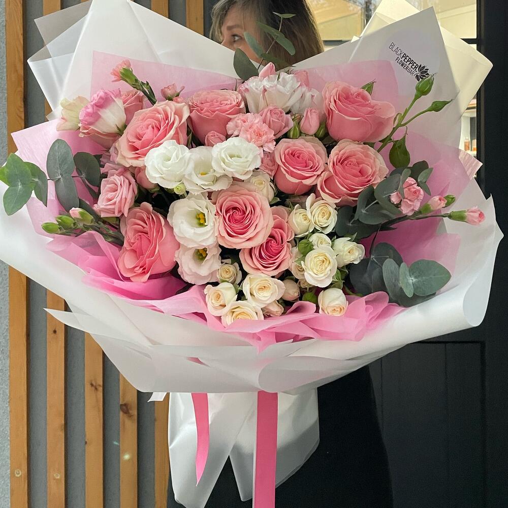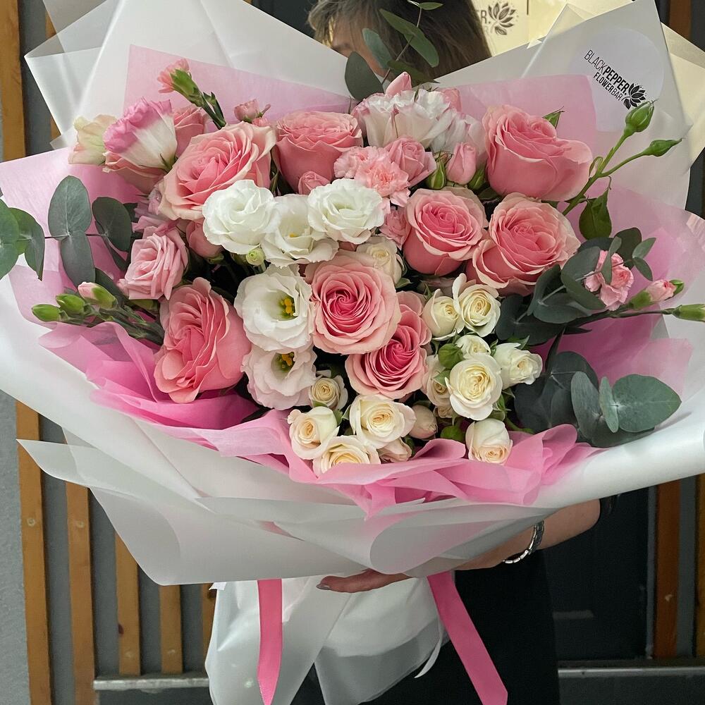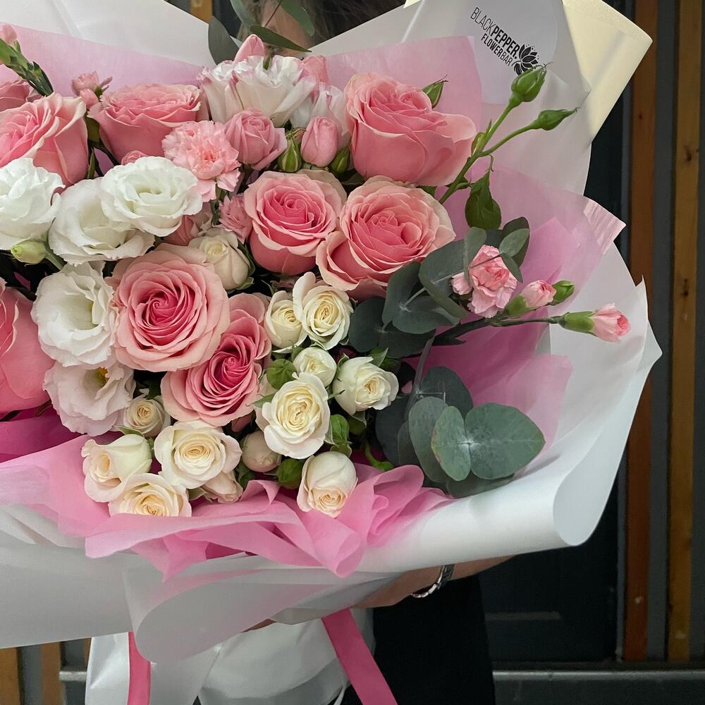Эвкалипт - 4 шт. Роза - 9 шт. Кустовая роза - 6 шт. Эустома - 4 шт. Диантус - 6 шт.
