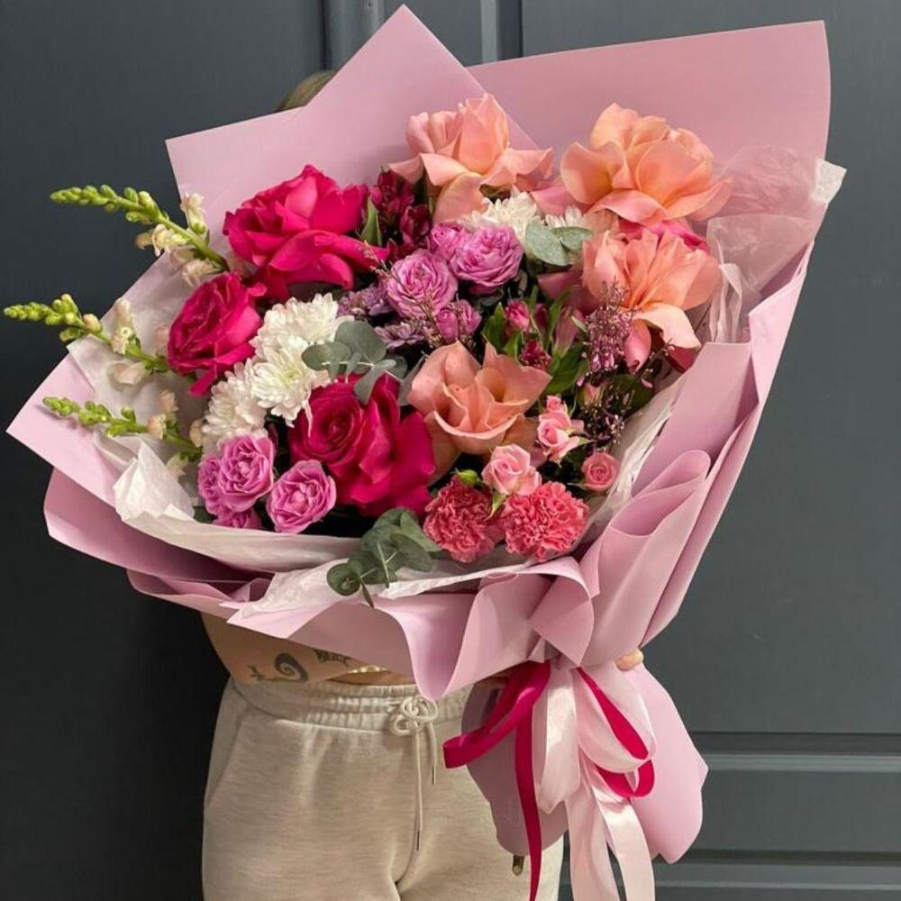Альстромерия - 4 шт. Роза кустовая - 4 шт. Хризантема кустовая - 4 шт. Роза Эквадор - 7 шт. Диантус - 2 шт. Львиный зев - 2 шт.