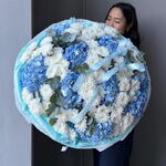 Гортензия - 9 шт. Хризантема кустовая - 15 шт. Эвкалипт - 2 шт. Оформление - 1 шт.