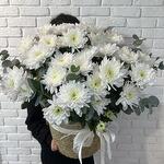 Хризантема кустовая - 15 шт. Эвкалипт - 7 шт. кашпо натуральное ротанговое - 1 шт.