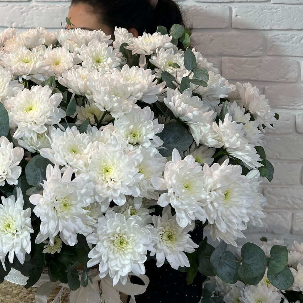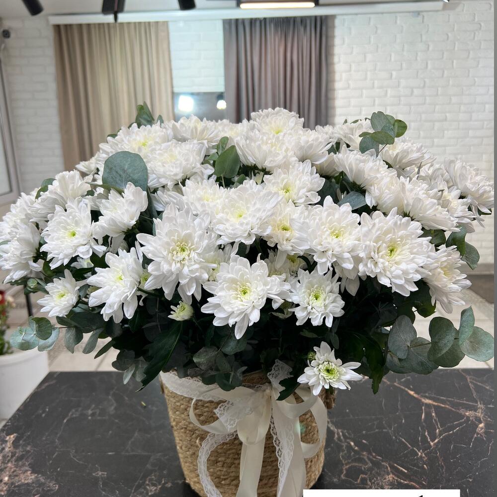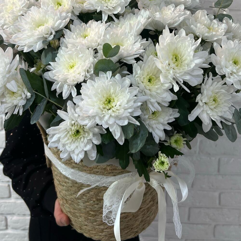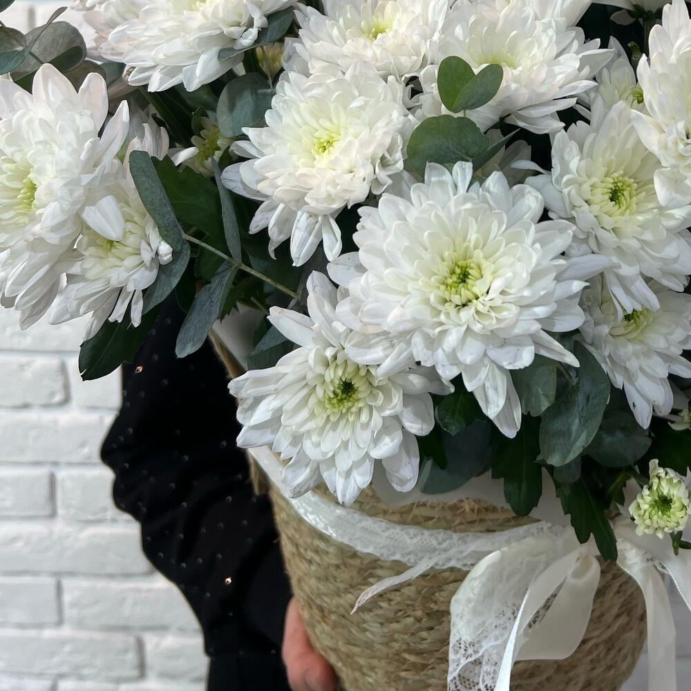 Хризантема кустовая - 15 шт. Эвкалипт - 7 шт. кашпо натуральное ротанговое - 1 шт.