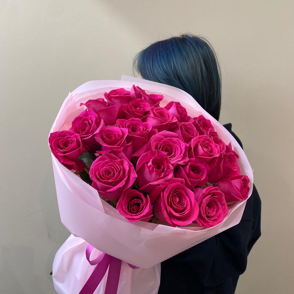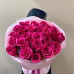 Изысканный букет из 25 малиновых роз. Яркий, насыщенный цвет, бархатные лепестки и нежный аромат делают эту композицию идеальным подарком для особенного человека и важного события.