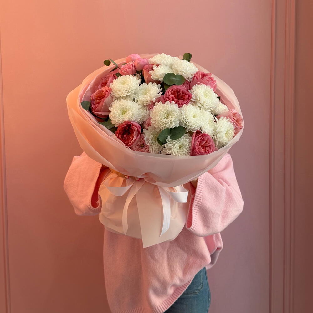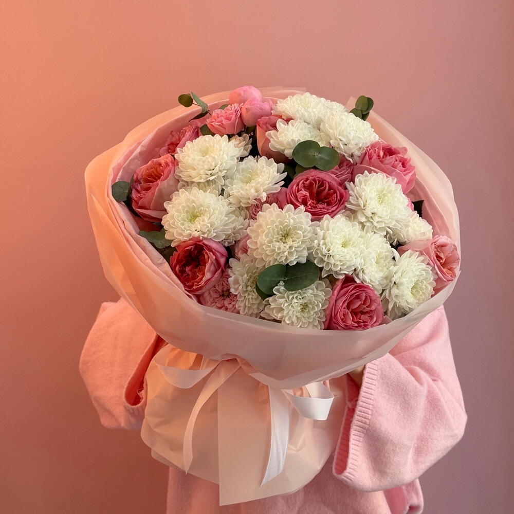 Хризантема кустовая - 4 шт. Эвкалипт Цинерея - 1 шт. пионовидные розы - 7 шт. пионовидные розы кустовые - 3 шт.