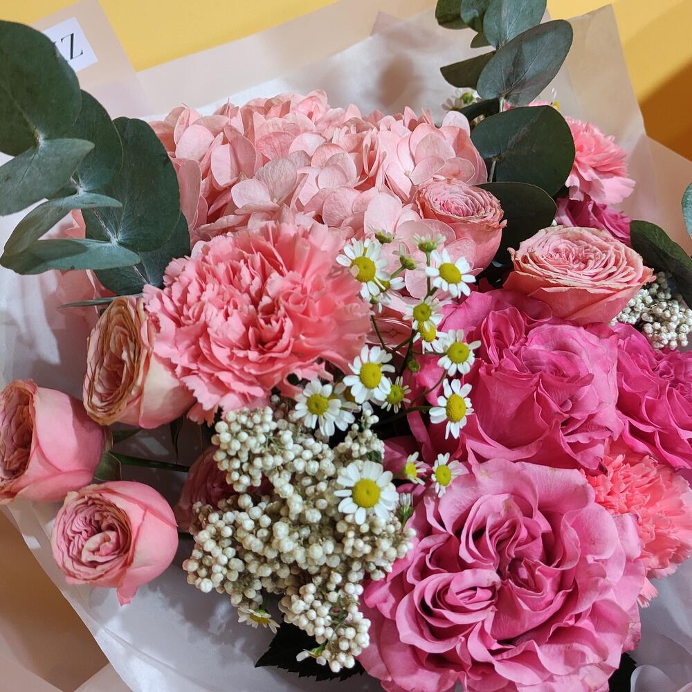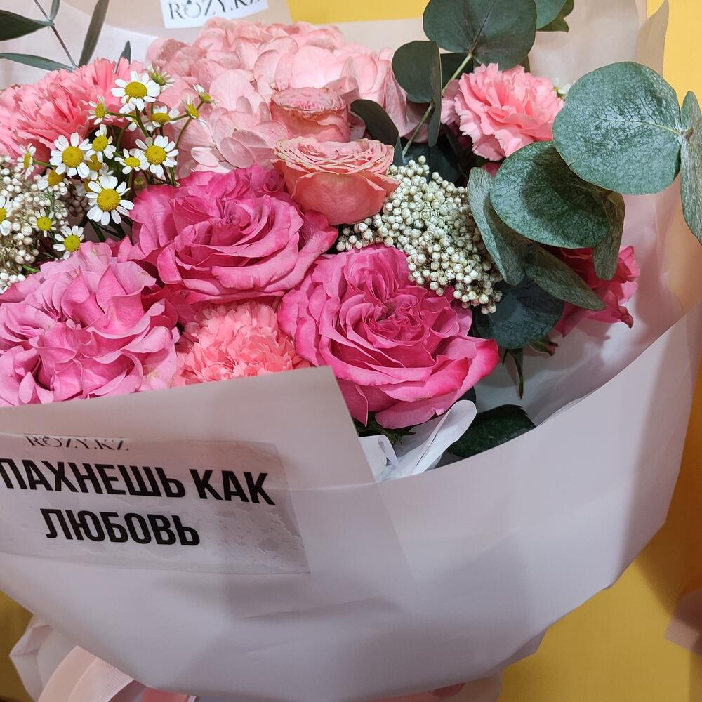 Нежный букет с розовыми оттенками и зеленью, создающий романтичное и легкое настроение.