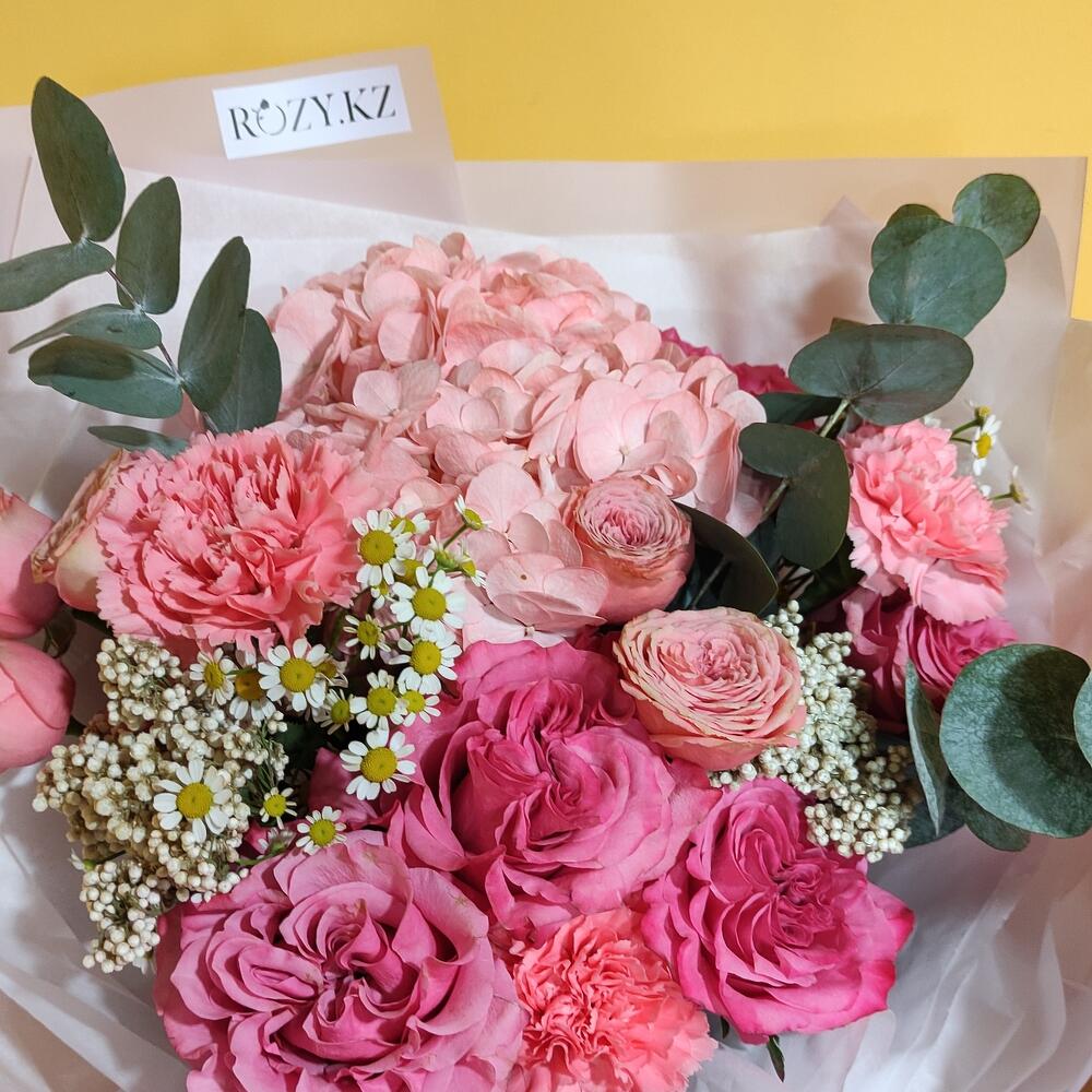 Гортензия - 1 шт. Озотамнус - 2 шт. Танацетум - 3 шт. Эвкалипт - 3 шт. Роза - 5 шт. Кустовая роза - 2 шт. Диантус - 3 шт.