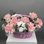 Изящная розовая корзина, наполненная раскрытыми розами и дополненная белоснежными хризантемами. Гармоничное сочетание цветов символизирует нежность, чистоту и теплоту. Оформление дополнено декоративными элементами, придающими композиции особую элегантность. Такой подарок идеально подчеркнет значимость момента и порадует близкого человека.