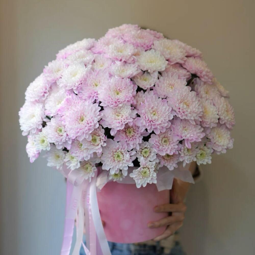 Коробка шляпная - 1 шт. Оазис флористический - 1 шт. хризантема алтай - 15 шт.