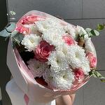 Букет из белых хризантем и розовых роз в нежной упаковке — утончённый и лёгкий, как прикосновение весны.