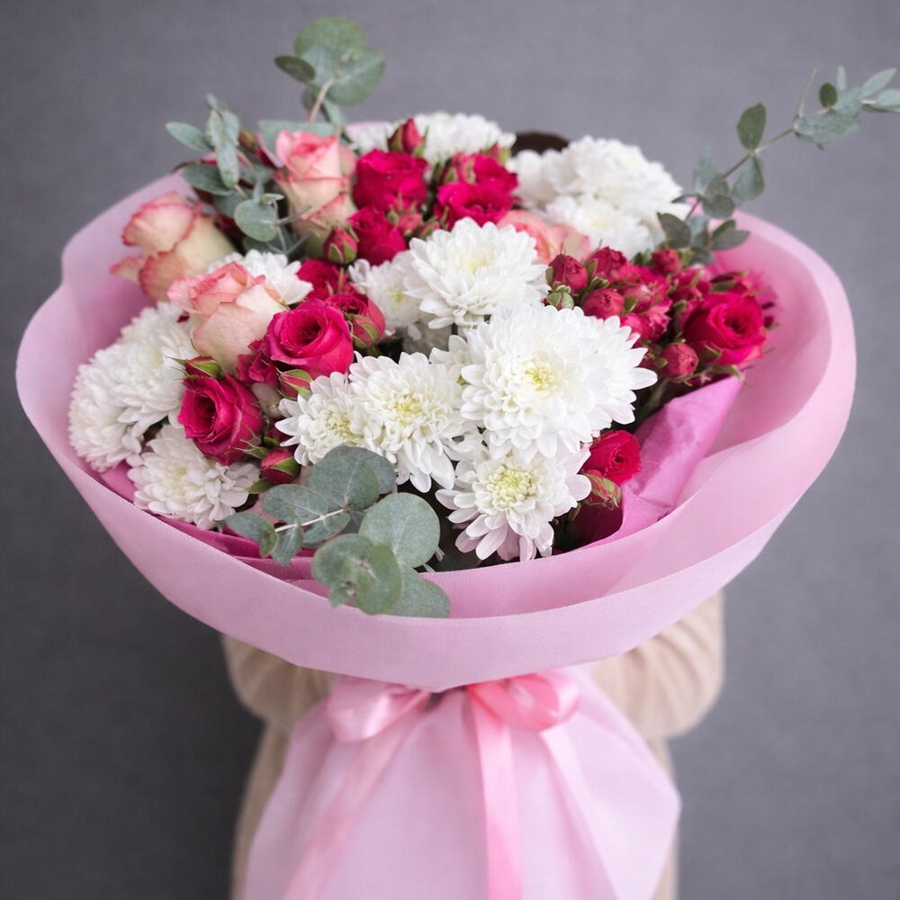 Роза кустовая - 5 шт. Эвкалипт Цинерея - 4 шт. розы - 4 шт. хртзантем кустовая - 5 шт.