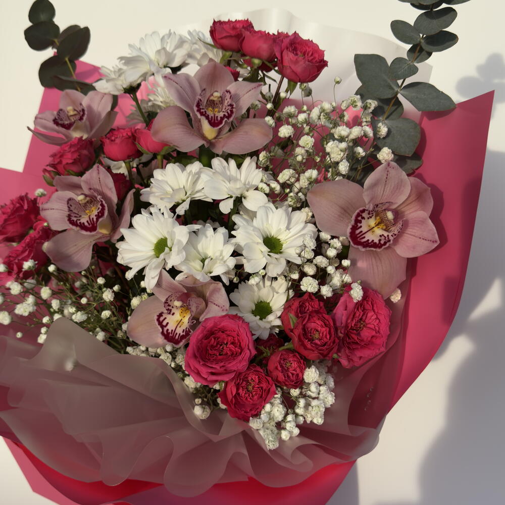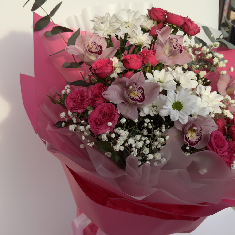 Нежный и одновременно яркий букет в розовых оттенках, который идеально передает теплые чувства и искренние эмоции. В композиции гармонично сочетаются изящные орхидеи, кустовые розы, воздушная гипсофила и белые хризантемы, создавая объемную и очень нежную цветочную композицию. Стильная розовая упаковка подчеркивает романтичность букета и делает его особенно эффектным. Такой букет станет прекрасным подарком для любимой девушки, мамы, сестры или подруги — на день рождения, 8 марта, свидание или просто как знак внимания. Состав букета: • орхидеи • кустовые розы • хризантемы • гипсофила • эвкалипт • декоративная упаковка