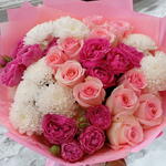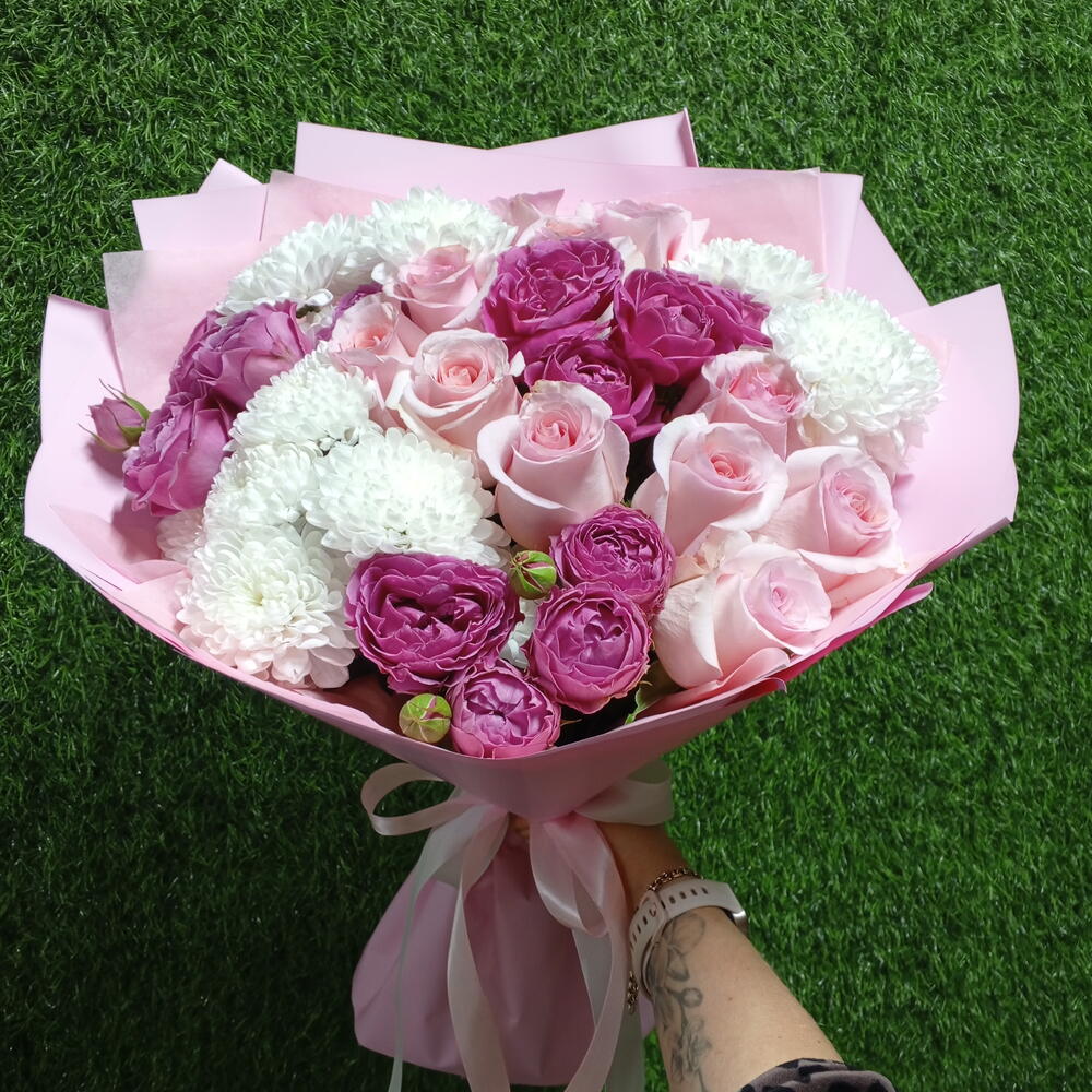 Зима за окном, а в руках — настоящее тепло 🤍 Нежные розовые розы, пионовидные акценты и воздушные белые хризантемы в стильной упаковке. Идеален: — для признания — для благодарности — для «просто так» — чтобы поднять настроение в снежный день Свежий. Объёмный. Очень нежный 💕