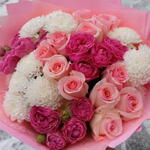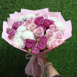 Кустовая хризантема - 3 шт. Кустовая пионовидная роза - 3 шт. Упаковка дизайнерская - 4 шт. Роза 40 см - 11 шт.