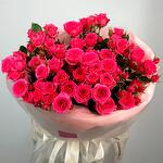 Пышный букет из ярких малиновых кустовых роз, каждая из которых словно воплощение страсти и энергии. Их насыщенный цвет и объём создают эффект роскошного цветочного вихря, который невозможно забыть. Нежная кремовая упаковка подчёркивает контраст, делая этот букет идеальным для самых торжественных моментов или яркого признания.