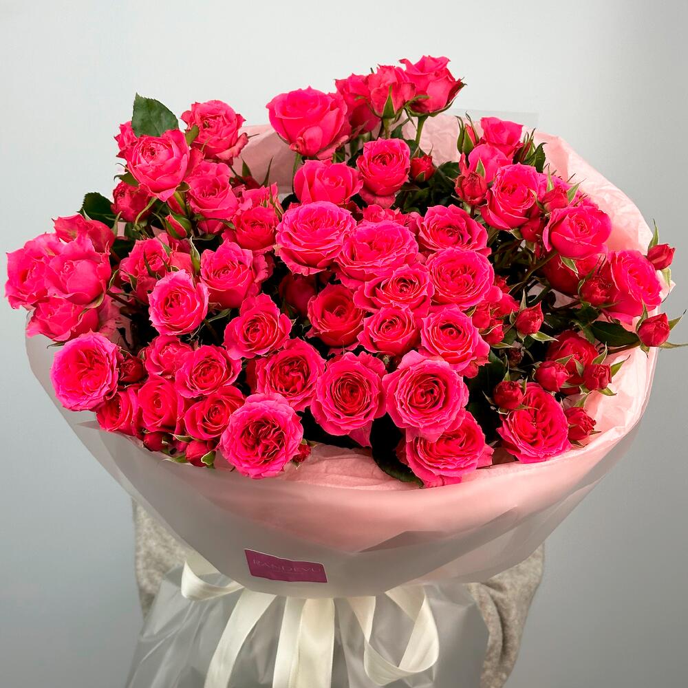 Пышный букет из ярких малиновых кустовых роз, каждая из которых словно воплощение страсти и энергии. Их насыщенный цвет и объём создают эффект роскошного цветочного вихря, который невозможно забыть. Нежная кремовая упаковка подчёркивает контраст, делая этот букет идеальным для самых торжественных моментов или яркого признания.