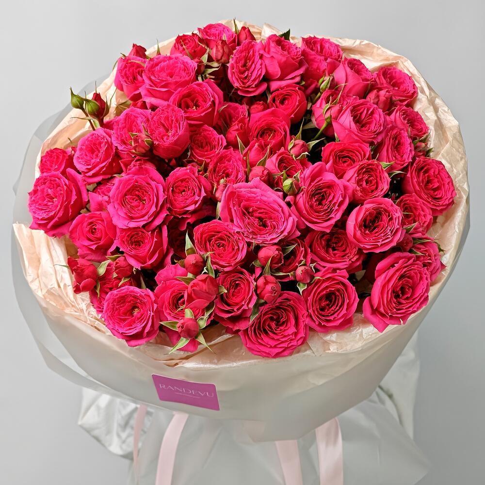 Пышный букет из ярких малиновых кустовых роз, каждая из которых словно воплощение страсти и энергии. Их насыщенный цвет и объём создают эффект роскошного цветочного вихря, который невозможно забыть. Нежная кремовая упаковка подчёркивает контраст, делая этот букет идеальным для самых торжественных моментов или яркого признания.